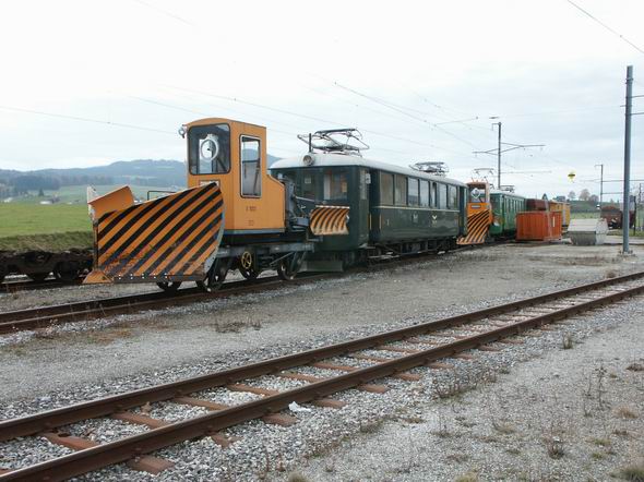 Les deux plus anciennes automotrices des TPF (Xe4/4 111 de 1903 et Be4/4 115 de 1905) sont encore très utiles ; ce sont les deux seules automotrices de service du réseau à voie métrique. Avant l’hiver, elles sont attelées aux chasse-neige X1003-II (1982) et X1004-II (1983). Nous les découvrons ici, prêts à partir en mission. Cette image est rassurante par le fait que nous n’avions plus revue la 111 depuis quelques temps (déclassée en 2002 suite à un incident de manoeuvre, voir nouvelle du 28.02.2002).