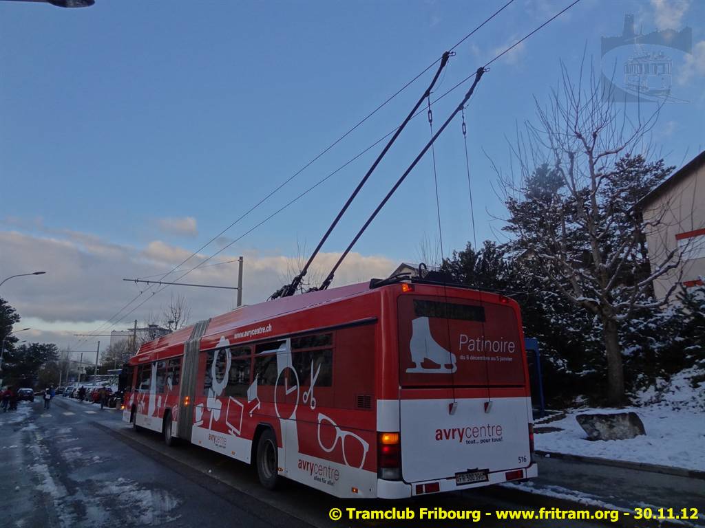 Le Bimode no 516 roule toujours pour Avry-Centre, mais son pelliculage bariolé a été mis à jour. Le rouge est dominant !