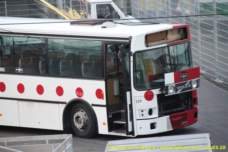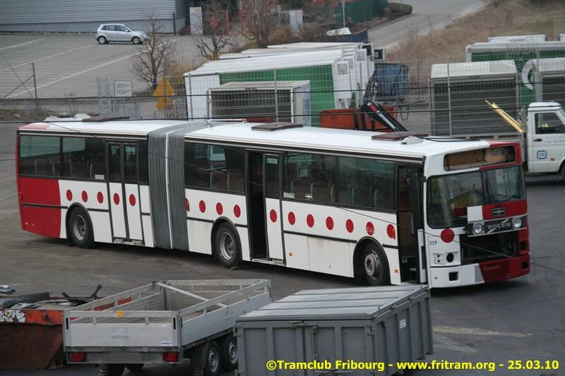 Après l’autobus no 118 la semaine dernière, c’est au tour de l’autobus articulé Volvo B10M VanHool no 119 de terminer sa course chez Kaufmann SA, le ferrailleur de la région fribourgeoise ! L’autobus no 119 était entré en service au mois de novembre 1988 aux GFM.