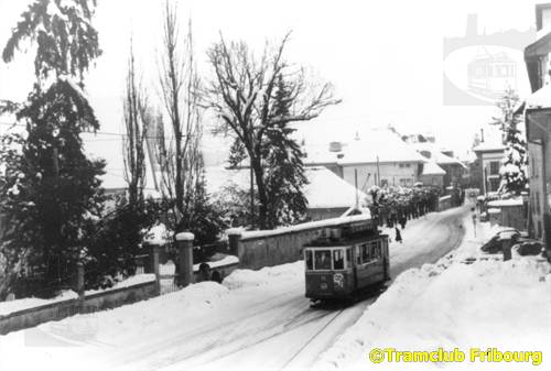Des hivers à Fribourg comme celui-ci étaient courants à Fribourg. Nous voyons ici la motrice no 13 se dirigeant vers le cimetière de St-Léonard, entrant sur l’évitement à la porte de Morat.
